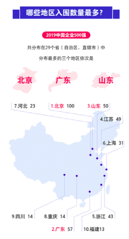 500强企业中哪个省份(直辖市、自治区)占比最多?北京多达100家,占比2成;广东57家位居第二,广东也是企业研发强度排名中持续位居榜首;山东50家居第三。