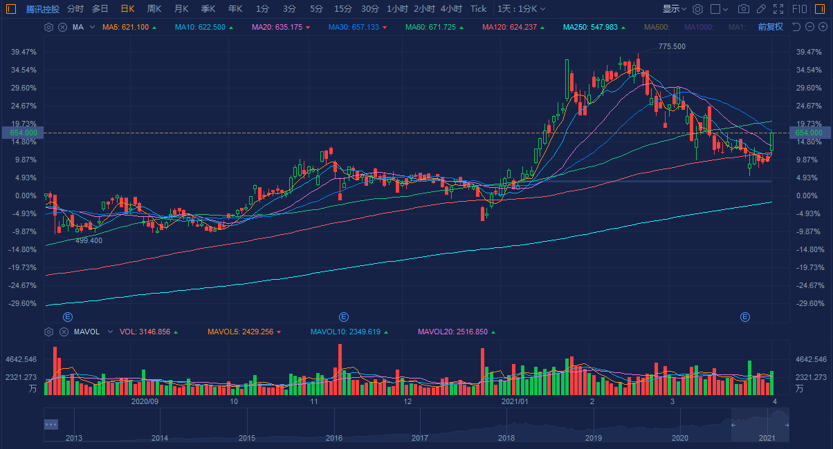 亚洲市场方面,港股科技龙头尾盘快速拉升,恒生指数涨1.5%,恒生科技指数大涨4.6%。 美团涨10%,腾讯涨逾7%,快手涨6%。腾讯控股临近尾盘涨幅扩大至6%以上,日内股价触及647港元高点。截止最新,南向资金净流入金额达到43.6亿港元。