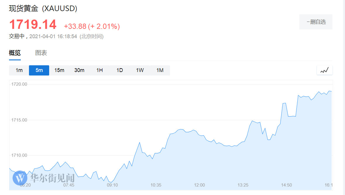 现货黄金日内涨幅超过2.0%,报1719.01美元/盎司。