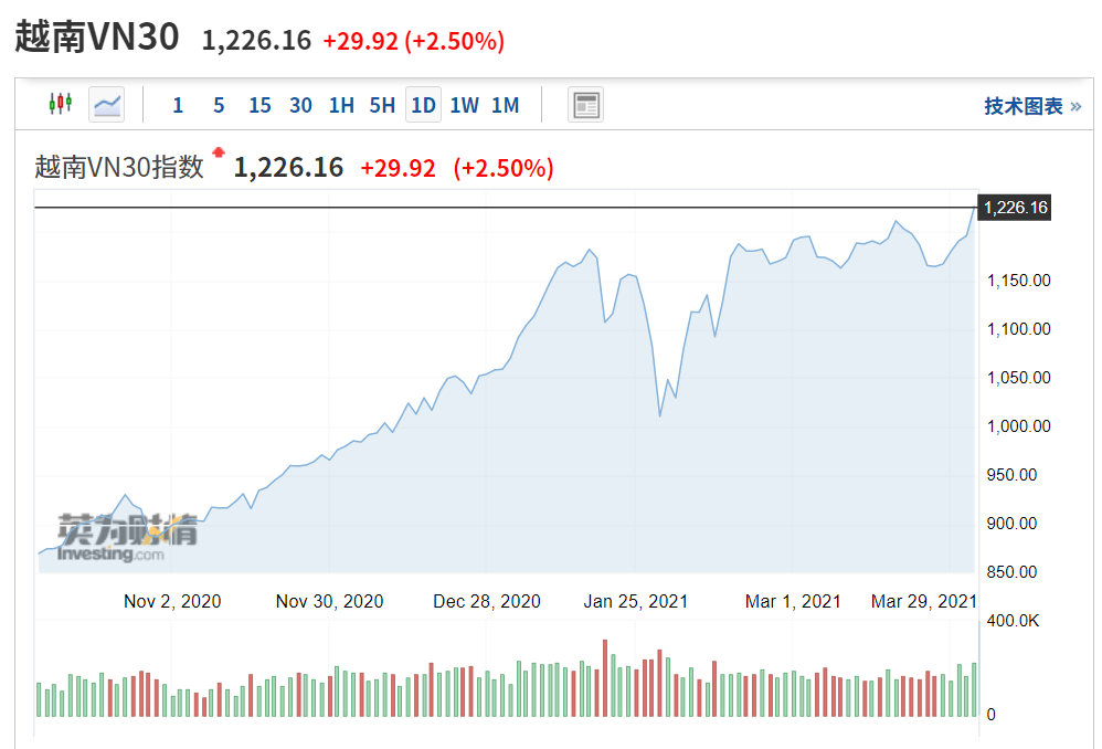 越南VN指数涨幅扩大至2.1%。