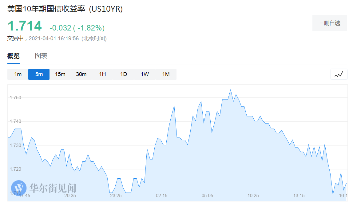 近期持续施压股市的美国国债收益率下行,作为基准的十年期美债收益率回落至1.71%附近: