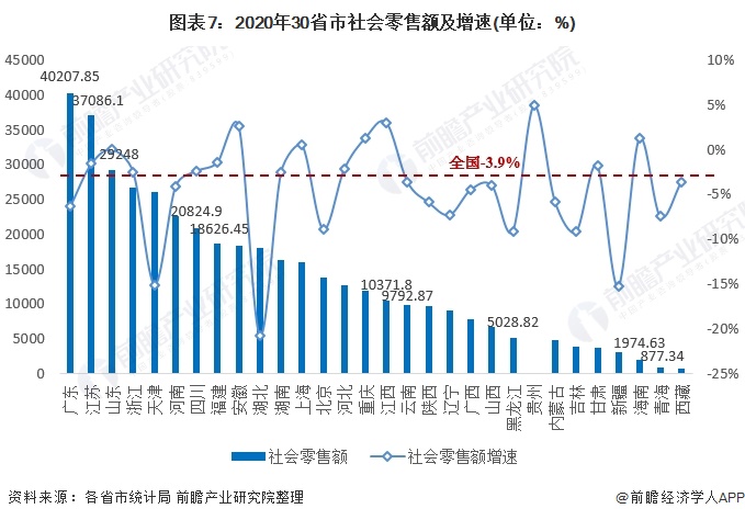 从增速来看,16个省市社会消费品零售总额增速在全国水平以上,但仅有6省市增速为正,最高为贵州,达4.9%。反映2020年疫情对我国消费影响较大。
