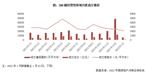 还有数据显示,截至1月23日,全国300城经营性土地总成交建筑面积仅5478万平方米,较去年12月下降近九成,同比降幅也接近七成;成交总金额降至1133亿元,环比上月大降90%,同比也下降了75%。平均楼板价跌至2069元/平方米,环比降幅达15%。