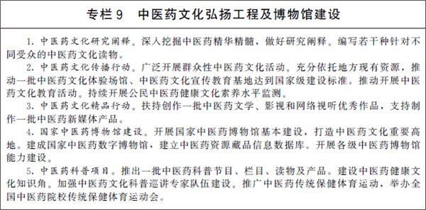 ——中医药文化大力弘扬。中医药文化产品和服务供给更为优质丰富,中医药博物馆事业加快发展,文化传播覆盖面进一步拓宽,公民中医药健康文化素养水平持续提高,中医药文化影响力进一步提升。